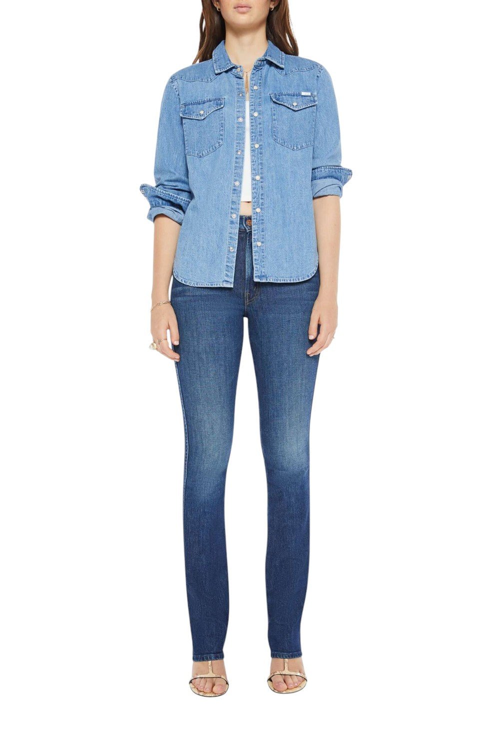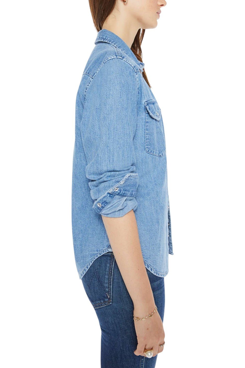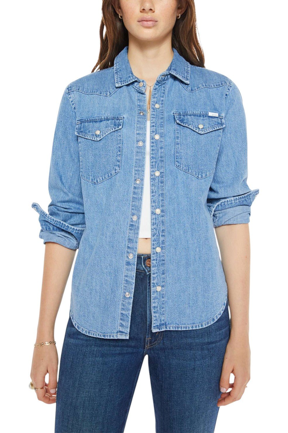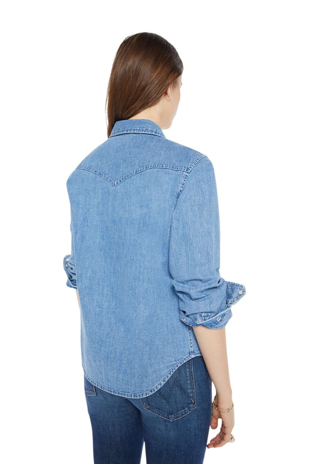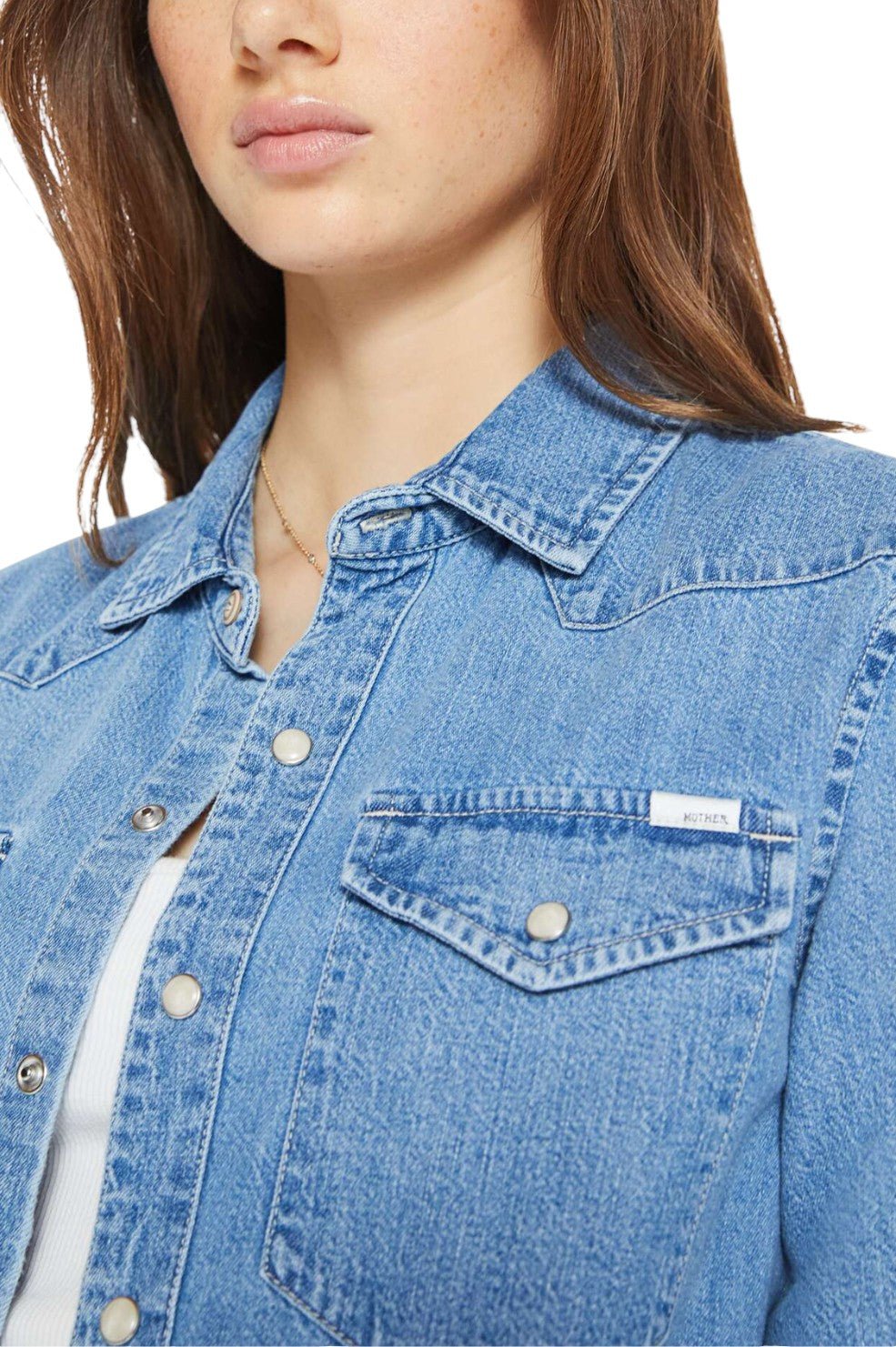 “All My Exes” from MOTHER is a denim dream with a Western twist. This button-up is crafted from 100% cotton and designed with front patch pockets, a curved hem, and faux pearl snaps that elevate its vintage-inspired, faded blue wash. A perfect blend of rugged charm and feminine flair, it’s your new go-to for laid-back yet elevated style.